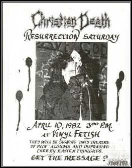 CHRISTIAN DEATH 'Only Theatre Of Pain' Release - Autograph Party Vinyl Fetish Los Angeles, California 10 April, 1982 Setlist: Unavailable Musicians: Rozz Williams: Vocals Rikk Agnew: Guitar James McGearty: Bass George Belanger: Drums